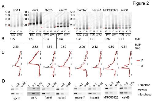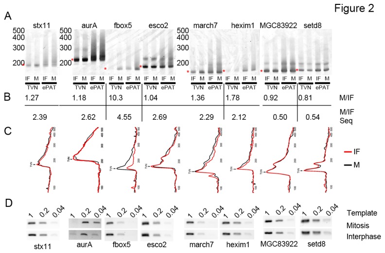 Figure 2. Poly-A tail analysis of selected mRNAs.mRNAs that exhibited changes in Mitosis:Interphase (M:IF) abundance ratios in oligo-dT-captured samples, but not in Cap-captured samples were analyzed for poly-A tail length using the ePAT assay and anchored TVN reverse transcription controls. A. Six mRNAs with high M:IF ratios (aurora-a, esco2, fbox5, stx11, march7, and hexim1) showed longer poly-A tails in mitotic extract. Two mRNA (setd8 and MGC83922) with a low M:IF ratio showed very modest changes in poly-A tail lengths between Mitosis and Interphase. Red asterix indicates the position of the prominent TVN PCR product that is quantified in B. B. The amount of PCR product contained in the TVN-RT PCR reactions (red asterix in A) were quantified. The ratio of the amount of PCR product in Mitotic to Interphase extracts is presented in the first line. The ratio of each mRNA in Mitotic and Interphase extracts as determined by RNA-seq is presented below the PCR derived ratios for comparison. In addition five mRNAs with high M:IF ratios (aurora-1, fbox5, stx11, march7, and hexim1) had increased amounts of minimal poly-A tail PCR products in mitosis compared to interphase in TVN controls (quantified below gel) while both setd8 and MGC88922 had higher levels of TVN PCR products in interphase compared to mitotic extracts TVN PCR products indicate mRNAs with poly-A tails of 18 As. Line traces of ePAT PCR reactions presented in panel A. Black lines indicate traces from mitotic extract and red lines indicate traces from interaphse extract. D. Semi-quantitative PCR for each of the mRNAs tested in A was performed on RNA from mitotic and interphase extracts. Random hexamers were used to prime reverse transcription for these reactions. A second experiment showing very similar results is present in Figure S2.