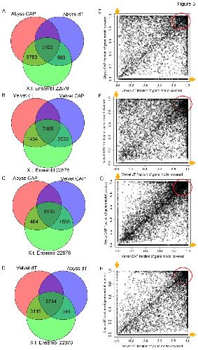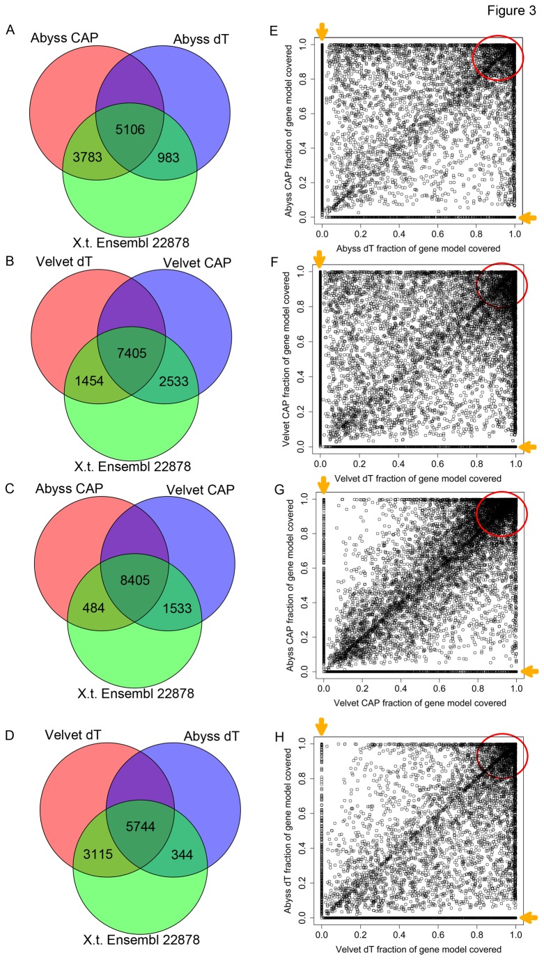 novo assembly align to X. tropicalis genes these numbers are omitted from the figure for the sake of simplicity. B. Same comparison as in A, except that Velvet was used as the assembler instead of Abyss. C. Transcripts assembled by Abyss or Velvet from Cap-capture mRNA libraries were aligned to the X. tropicalis ENSEMBL transcripts using BLAT. Unique and common ENSEMBL transcripts are represented by a Venn Diagram D. Same comparison as in C, except that dT libraries are compared instead of Cap-captured libraries. E-H. Fraction of each ENSEMBL transcript covered by transcripts assembled using indicated assembler:library pair (from A-D) was calculated.