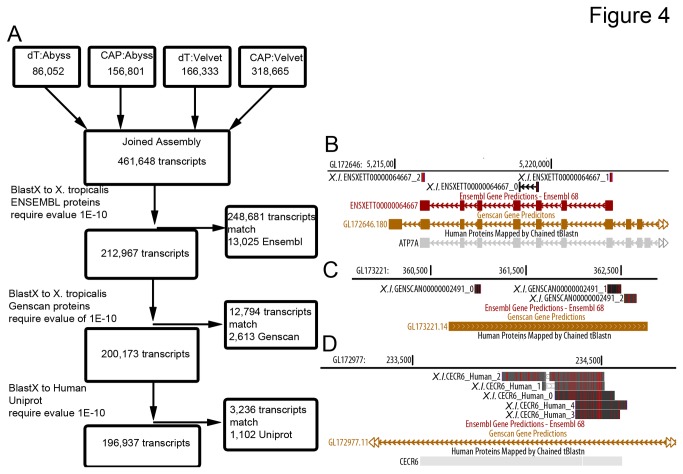 Figure 4. Overview of combined X. laevis transcriptome.A. Sequences from each assembler:library pair were combined. Transcripts from this combined library were sequentially aligned to X. tropicalis (Xt) ENSEMBL transcripts, X. tropicalis Genscan transcripts, and human Uniprot proteins using BLASTX. The number of transcripts that matched to each annotation source and the number of annotated transcripts that were matched are indicated. B. UCSC genome browser view that demonstrates clustering of transcript fragments by using the annotated ENSEMBL transcript as a scaffold. C. UCSC genome browser view of transcript clustering of transcripts that match to a GENSCAN gene prediction. D. Example of several transcripts that match to an annotated human protein while there are no predicted X. tropicalis transcripts.