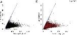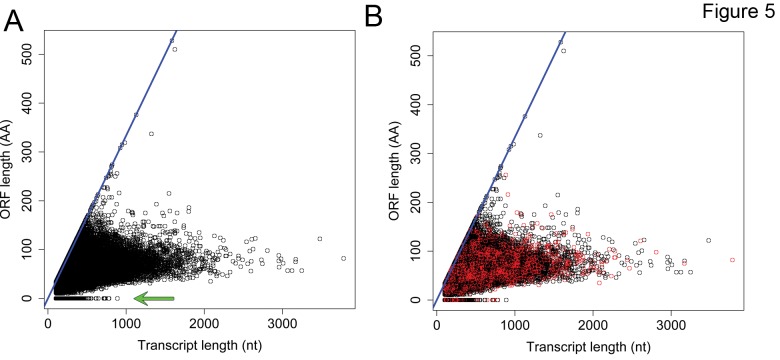 Figure 5. Analysis of unannotated transcripts in X. laevis.A. Transcripts remaining after alignment to several sources of annotated genes (in Figure 4A) were analyzed for protein coding potential using Orfpredictor. Plot shows that length of the longest ORF compared to the length of the mRNA sequence, blue diagonal line indicates a transcript that is completely composed of a potential ORF. Horizontal line highlighted with a green arrow indicates sequences with no protein coding potential. B. Same plot as in A, but sequences that matches to annotated X. laevis Refseq transcript 3’UTR sequences are highlighted in red.