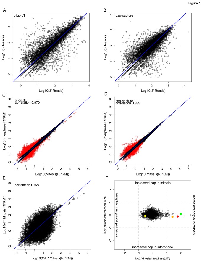Figure 1. Comparison or mRNA-seq libraries from oligo-dT and Cap-captured mRNA.A-B. Reads from dT or Cap-capture prepared libraries were aligned to sequences consisting of the 5â or 3â 25% of Refseq mRNAs. Reads aligning to the 5â and 3â portions of the transcript are plotted. Blue line indicates a ratio of one. C. Reads from mRNA-seq libraries prepared using oligo-dT captured mRNAs from mitotic and interphase Xenopus egg extract were aligned to the Xenopus laevis Unigene database. Relative abundance of each mRNA in mitotic and interphase extracts is plotted. Red points highlight two-fold differences between mitotic and interphase samples. D. Same experiment as in panel C except that the mRNAs were purified using Cap-capture prior to library preparation. Red points highlight two-fold differences. E. Scatterplot of mRNA abundance in oligo-dT-captured and Cap-captured mRNA libraries. F. The ratio of reads per mRNA in mitotic and interphase extracts are plotted for oligo-dT captured mRNAs (X-axis, data from panel A) and cap-captured mRNAs (Y-axis data from panel B). The colored points correspond to mRNAs with known changes in poly-A tail length (cdk1, green; Eg2/aurora-a, orange; mos, red; Xlcl1, yellow). Quadrants highlight two-fold differences between samples.