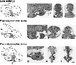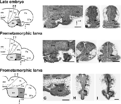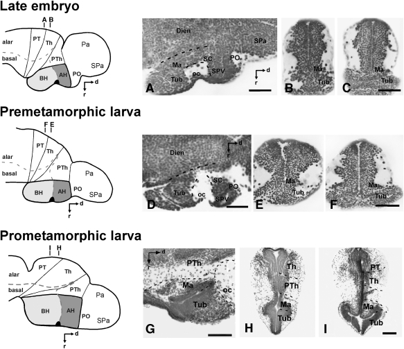 Figure 1. Photomicrographs of Nissl-stained sagittal (A,D,G) and transverse (B,C,E,F,H,I) sections through the basal hypothalamus of a late embryo (A–C), a premetamorphic larva (D–F), and a prometamorphic larva (G–I) at the approximate levels indicated on the respective schemes of the left column. Note that the coordinate system for the hypothalamus rotates 90° because the longitudinal axis of the brain bends in the diencephalon, and this is also the case for all photomicrographs of sagittal sections in all figures. These photomicrographs illustrate the poorly segregated regions in the basal hypothalamus and the scarce cell migration from the periventricular lining during development. The dashed lines in (A,D,G) indicate the approximate boundaries between hypothalamic and diencephalic regions, whereas in (H,I) they also indicate the approximate boundaries of the thalamus, prethalamus, and pretectal diencephalic regions. Scale bars = 200 μm (in C,F,I are valid for B,E,H, respectively) |