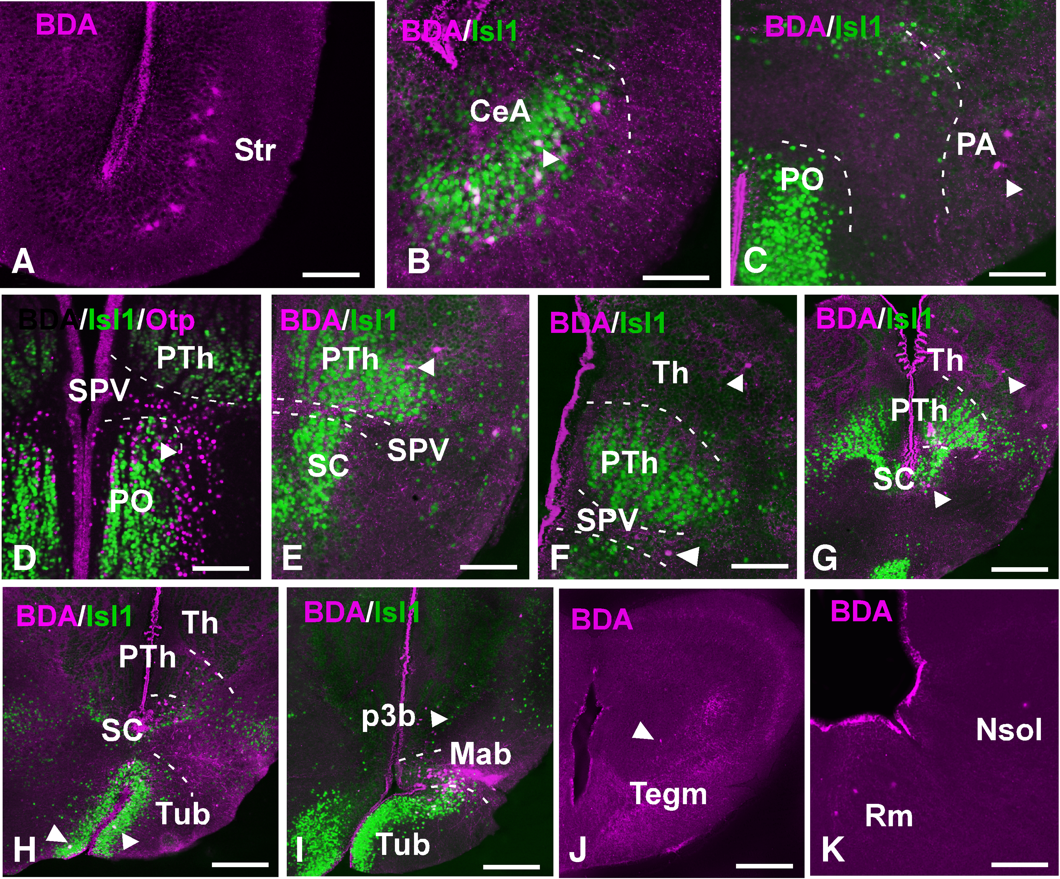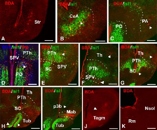 Supplementary Figure 7. Photomicrographs of transverse sections showing the retrogradely labeled cells and anterogradely labeled fibers after BDA injection in the Ma of juvenile Xenopus, combined with the markers Isl1 (B-I) and Otp (D) to corroborate that the tracer was delivered into this particular area. The arrowheads in b-j indicate retrogradely labeled cells. Sclae bars: 200 μm (G-I, J'), 100 μm (A-F, K). This figure corresponds to the figure 9. |