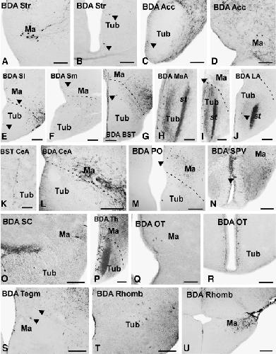 Figure 11. Photomicrographs of transverse sections through the brain of X. laevis showing retrogradely labeled cells and anterogradely labeled fibers in the tuberal and mammillary regions after BDA injections carried out in the different brain centers indicated in each photograph. The arrowheads in (B,C,E–G,I,J,M,N,S) point to labeled cells and fibers. Scale bars = 200 μm in B,C,E–J,L–N,P,R,U; 100 μm in A,D,O,Q,S,T; 50 μm in K. |