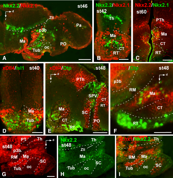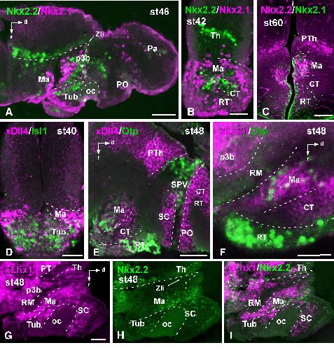 Figure 5. Photomicrographs of sagittal (A,E–I) and transverse (B–D) sections through the developing hypothalamus of Xenopus showing in the mammillary region and adjacent areas the combined expression of Nkx2.2 and Nkx2.1 (A–C), xDll4 and Isl1 (D), xDll4 and Otp (E), xLhx1 and Otp (F). Single expression for xLhx1 (G) and Nkx2.2 (H) are shown together with the merged image (I). Developmental stages are indicated in each photograph. A magenta-green version of this figure is provided as Supporting Information Fig. 4. Scale bars = 100 μm (in G is valid for H,I). |