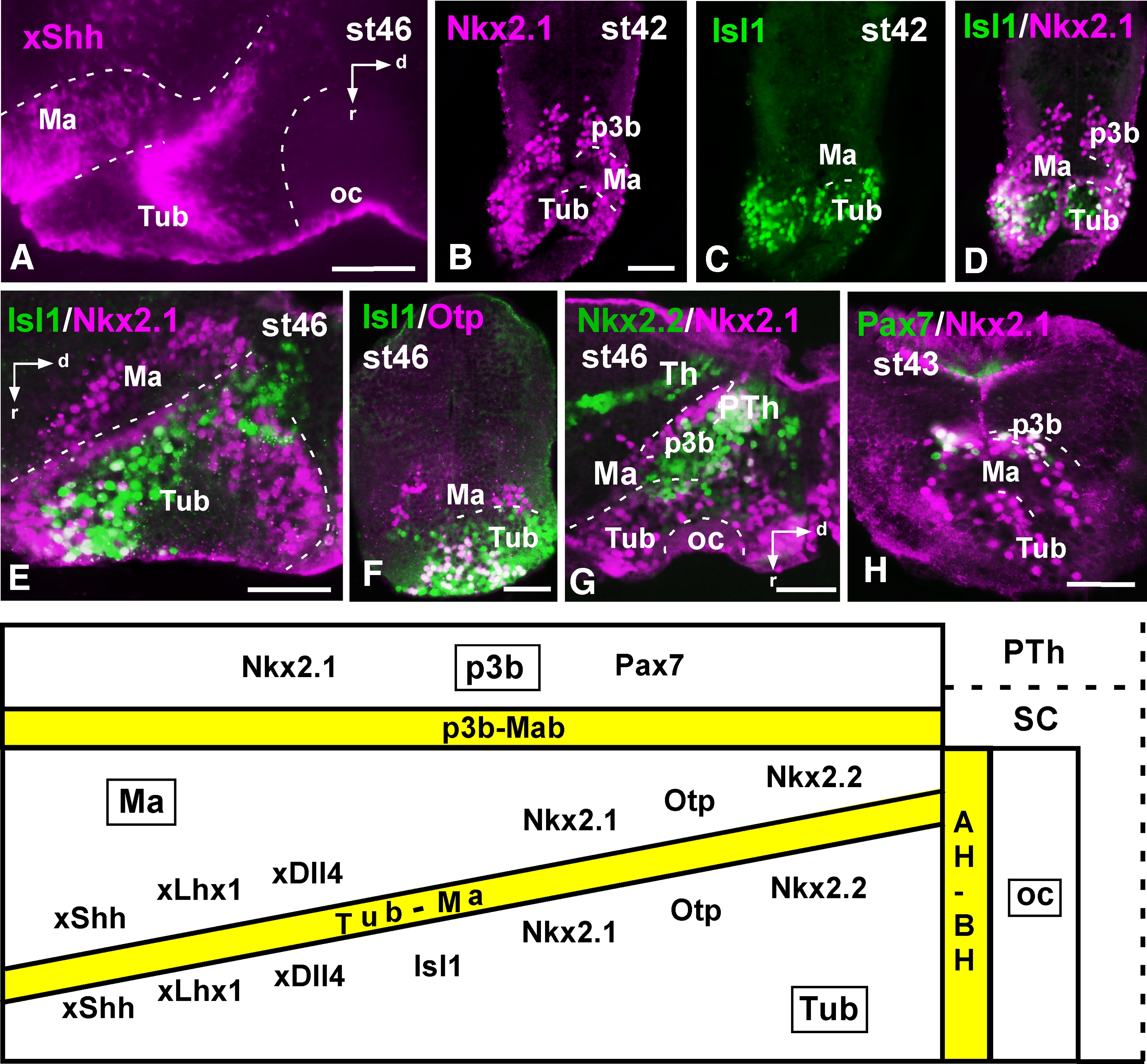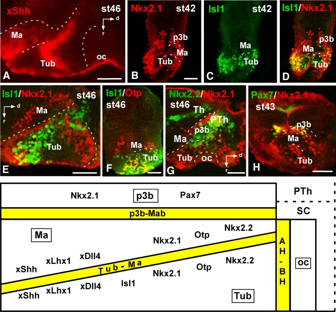 Figure 2. Photomicrographs of sagittal (A,E,G) and transverse (B–D,F) sections through the mammillary and tuberal hypothalamus of Xenopus, showing the expressions of xShh (A), Nkx2.1 (B), and Isl1 (C) and the combined expressions of Isl1 and Nkx2.1 (D,E), Isl1 and Otp (F), Nkx2.1 and Nkx2.2 (G), and Pax7 and Nkx2.1 (H). Developmental stages are indicated in each photograph. The schematic representation at the bottom summarizes the boundaries between the different basal hypothalamic subdivisions and the combinatorial code of markers of each region. The yellow lines indicate the limit between two adjacent regions revealed by the different markers. A magenta-green version of this figure is provided as Supporting Information Fig. 1. Scales bars = 100 μm in A,F–H, B (valid for C,D); 50 μm in E. |