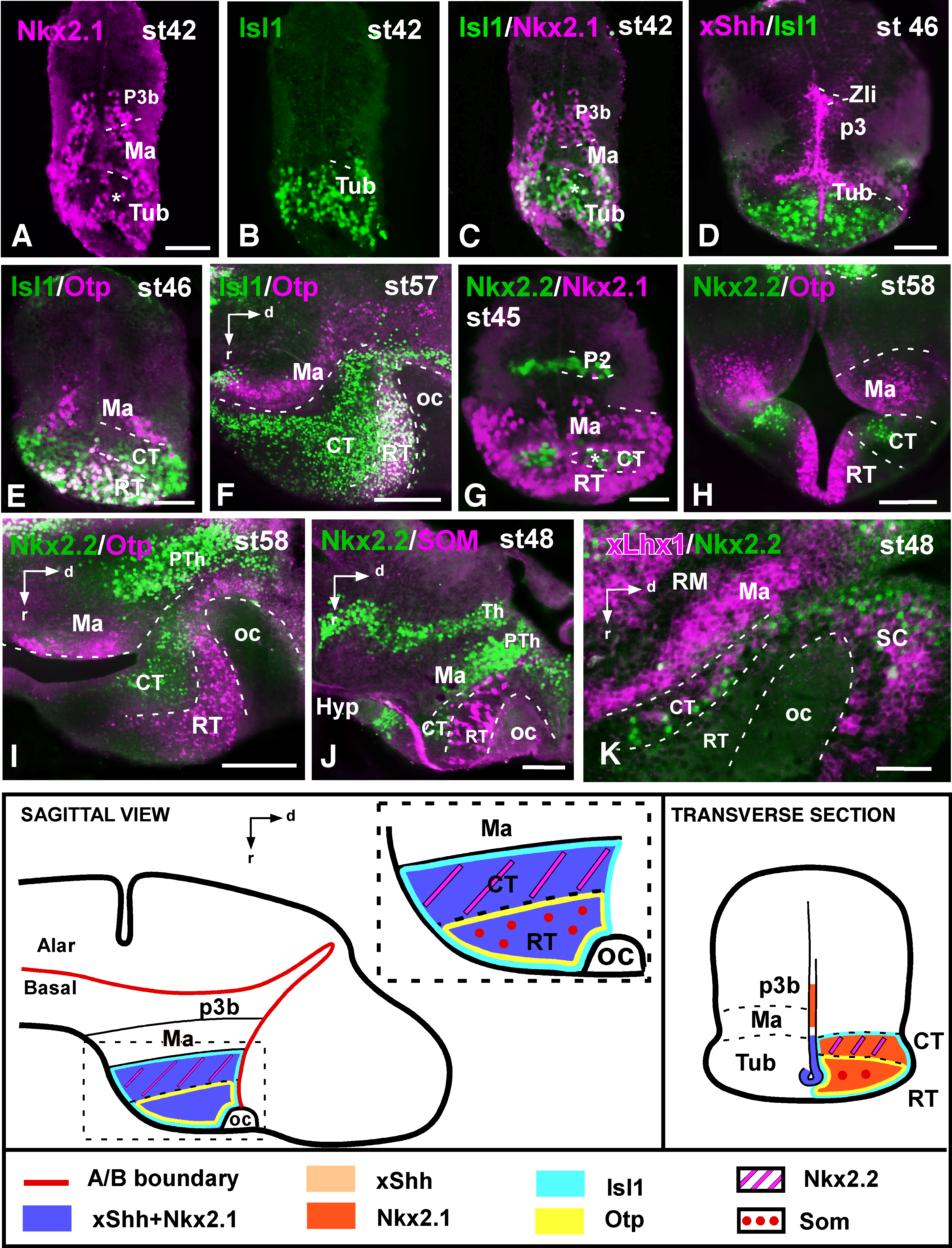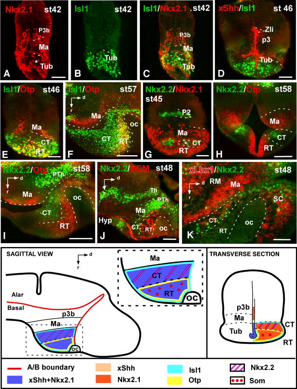 Supplementary Figure 2. Photomicrographs of transverse (A-E,G, H) and sagittal (F, I-K) sections through the hypothalamus of Xenopus showing in the tuberal region and adjacent areas the expressions of Nkx2.1 (A) and Isl1 (B), and the combined expressions of Isl1 and Nkx2.1 (C), xShh and Isl1 (D), Isl1 and Otp (E,F), Nkx2.2 and Nkx2.1 (G), Nkx2.2 and otp (H,I), Nkx2.2 and SOM (J), and xLhx1 and Nkx2.2 (K). Developmental stages are indicated in each photograph. The schematic representations at the bottom summarize the combinatorial codes of the markers in the tuberal hypothalamus in a lateral view of the brain and a transverse section. Scale bars: 100μm. The scale bar in A is valid for B and C. This figure corresponds to the figure 3. |