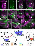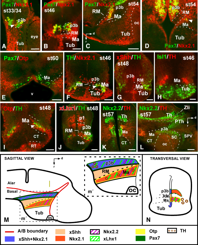 Figure 6. Photomicrographs of transverse (A,B,D–K) and sagittal (C,L) sections through the developing hypothalamus of Xenopus showing in the mammillary region and adjacent areas the combined expressions of Pax7 and Nkx2.1 (A,D) and Pax7 and Otp (E). The arrowheads in (A,D,E,F) show double-labeled cells. In addition, images are shown of the combined labeling for TH with Nkx2.1 (F), xShh (G), Isl1 (H), Otp (I), xLhx1 (J), and Nkx2.2 (K,L). The schematic representations at the bottom summarize the combinatorial codes of the markers in the mammillary hypothalamus in a lateral view of the brain and a transverse section. A magenta-green version of this figure is provided as Supporting Information Fig. 5. Scale bars = 100 μm in A,B,E–L (in E is valid for D); 50 μm in C |