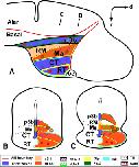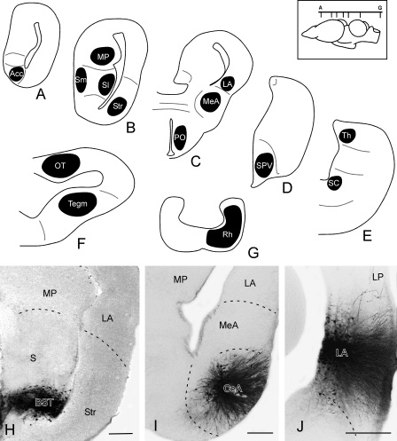 Figure 10. Schematic drawings of transverse sections through the brain of X. laevis illustrating the representative injection sites used in the confirmation experiments. The levels of the selected transverse sections (A–G) are indicated in the upper right scheme of the brain. H–J: Photomicrographs showing the examples of injection sites in the bed nucleus of the stria terminalis (H), central amygdala (I), and lateral amygdala (J). Scale bars = 100 μm. |
