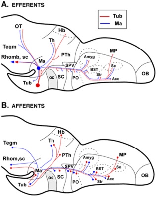 Figure 12. Schemes in sagittal view summarizing the main afferent and efferent connections of the tuberal and mammillary regions in Xenopus. |