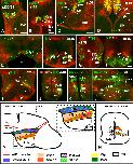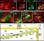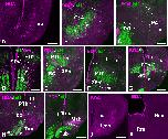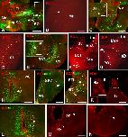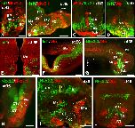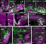 Supplementary Figure 3. Photomicrographs of transverse (A, C-F, H, J) and sagittal (B, G, I) sections through the developing hypothalamus of Xenopus showing in the mammillary region and adjacent areas the combined expression of Isl1 and Nkx2.1 (A,B), xShh and Nkx2.1 (C), Isl1 and Otp (D, E, F), Nkx2.2 and Otp (G I, J), Nkx2.2 and Nkx2.1 (H). The level of the transverse section shown in J is indicated by the vertical yellow line drawn in I. Developmental stages are indicated in each photograph. Scale bars: 100μm. This figure corresponds to the figure 4. |