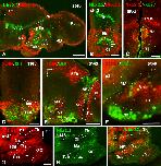 Figure 4. Photomicrographs of transverse (A,C–F,H,J) and sagittal (B,G,I) sections through the developing hypothalamus of Xenopus showing in the mammillary region and adjacent areas the combined expression of Isl1 and Nkx2.1 (A,B), xShh and Nkx2.1 (C), Isl1 and Otp (D,E,F), Nkx2.2 and Otp (G,I,J), Nkx2.2 and Nkx2.1 (H). The level of the transverse section shown in (J) is indicated by the vertical yellow line drawn in (I). Developmental stages are indicated in each photograph. A magenta-green version of this figure is provided as Supporting Information Fig. 3. Scale bars = 100 μm. |