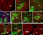 Figure 9. Photomicrographs of transverse sections showing the retrogradely labeled cells and anterogradely labeled fibers after BDA injection in the mammillar area of juvenile Xenopus, combined with the markers Isl1 (B-I) and Otp (D) to corroborate that the tracer was delivered into this particular area. The arrowheads in B–J indicate retrogradely labeled cells. A magenta-green version of this figure is provided as Supporting Information Fig. 7. Scale bars = 200 μm in G–I,J'; 100 μm in A–F,K. |