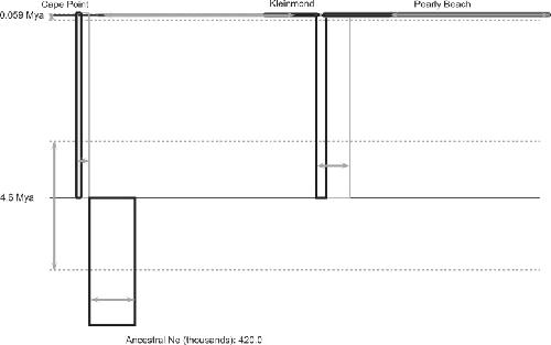 Figure 3. IMa2 coalescent analysis of Xenopus gilli.Result of the coalescent analysis (in IMa2) provides histories for the three disjunct areas sampled which are represented as boxes (for sampled and ancestral populations), horizontal lines (for splitting times). The size of the boxes on the horizontal axis is proportional to estimated current and ancestral population sizes. Time is represented on the vertical axis, with the sampled sites at the top representing the sampling time. Estimated error is shown in grey (boxes and arrows).