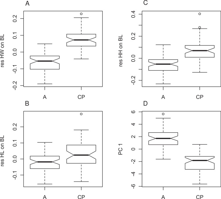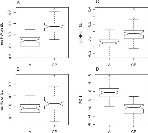 Figure 4. Morphometric differences between genetically defined populations of Xenopus gilli.Notched box and whisker plots display the direction of significantly different head measurements between sites identified by genetic differences (CP: Cape peninsula and (A) Agulhas plain sites Pearly Beach and Kleinmond). All plots are corrected for size and therefore based on residuals of each measurement on body length (SVL). (A) Head length (HL), (B) head width (HW) and (C) head height (HH) are all significantly different between sites (p < 0.001). (D) Values for principle component 1 also show significant differences. When notches do not overlap, there is ‘strong evidence’ that their medians differ (Chambers et al., 1983).