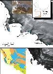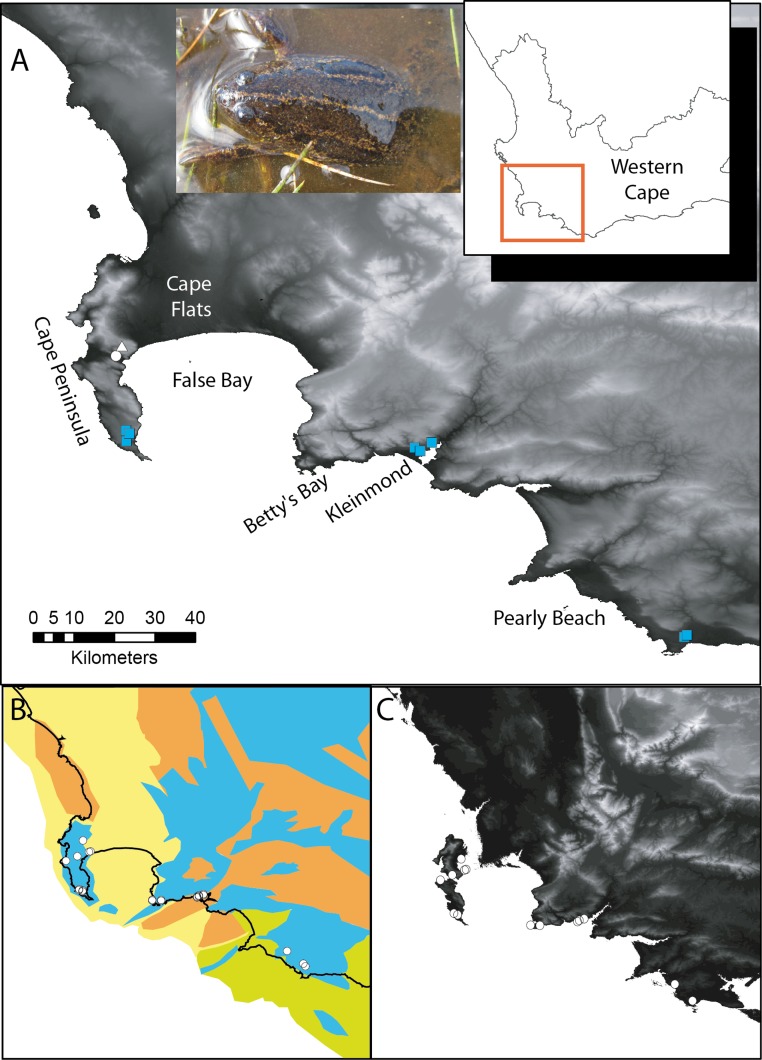 Figure 1. Xenopus gilli sites in the southwest of South Africa.(A) Sampling sites for the present study, squares indicate where Xenopus gilli was sampled for this study. A triangle denotes an introduced population (Measey & de Villiers, 2011), and the white filled circle the presumed type locality: Silvermine River. Note that the squares are distributed in three disjunct areas at the end of the Cape Peninsula near the towns of Kleinmond and Pearly Beach. (B) Vegetation types (after Mucina & Rutherford, 2006) and their projection onto the exposed Agulhas bank after a 120 m reduction in sea level (current coastline is shown as a black line) following Compton (2011). Note that current and historical sites for X. gilli (circles) are associated with lowland Sand-stone fynbos (blue) and not with Sand fynbos (yellow), Renosterveld (brown) or Strandveld (green). (C) Relief map of the same southwestern Cape region after a 25 m increase in sea level. Note that the Cape peninsula becomes two islands separated from the mainland by inundation of the Cape Flats. X. gilli sites in Betty’s Bay and Kleinmond are separated from those at Pearly Beach by high ground and a salt-water estuary.
