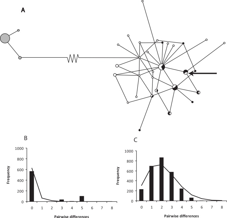 Figure 2. A network of ND2 haplotypes for Xenopus gilli populations.(A) Median-joining network diagrams of the number and structure of X. gilli haplotypes in the Cape peninsula and eastern populations based on ND2. Cape peninsula animals are indicated in grey, Pearly Beach indicated in white and Kleinmond in black. Circles are proportional to the number of individuals sequenced belonging to each haplotype and lines represent the number of nucleotide base pair changes from one to the other. Note that the 74 base pair changes between the two haplotype groups are represented by a broken line. The arrow points at a haplotype not included in the analysis but found on the Cape peninsula. (B) Pairwise difference and frequency for ND2 haplotypes for Xenopus gilli from the Cape peninsula, and (C) Pearly Beach and Kleinmond.