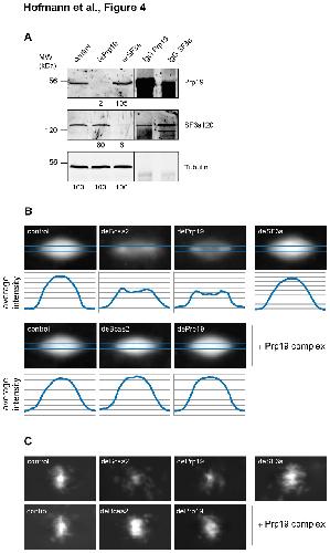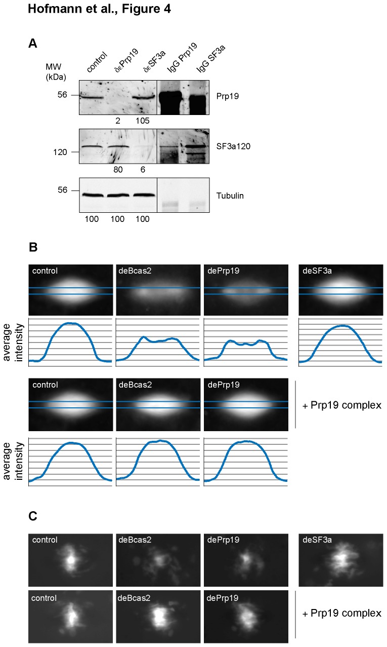 Figure 4. Depletion of the Prp19 complex specifically compromises spindle formation in Xenopus egg extracts.Xenopus egg extracts were depleted of the Prp19 complex or the U2 specific SF3a protein complex using specific antibodies (dePrp19, deSF3a120); an unspecific IgG served as a control. (A): The levels of Prp19 and the SF3a120 protein were analyzed by immunoblotting using tubulin as a loading control (see numbers). (B, C): Microtubule assembly was monitored in egg extracts after addition of sperm nuclei (DAPI, DNA, in C) and Cy3-tubulin (in B). 20 spindles were analyzed under all conditions, aligned and averaged (z-projection, average, ImageJ). (B): average microtubule intensity projections. Graphs show average intensity distributions along the pole-to-pole axes indicated in projections in blue. (C): chromatin distributions as determined from the DAPI signal.
