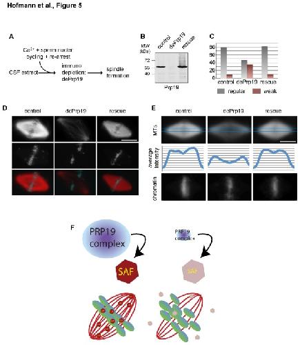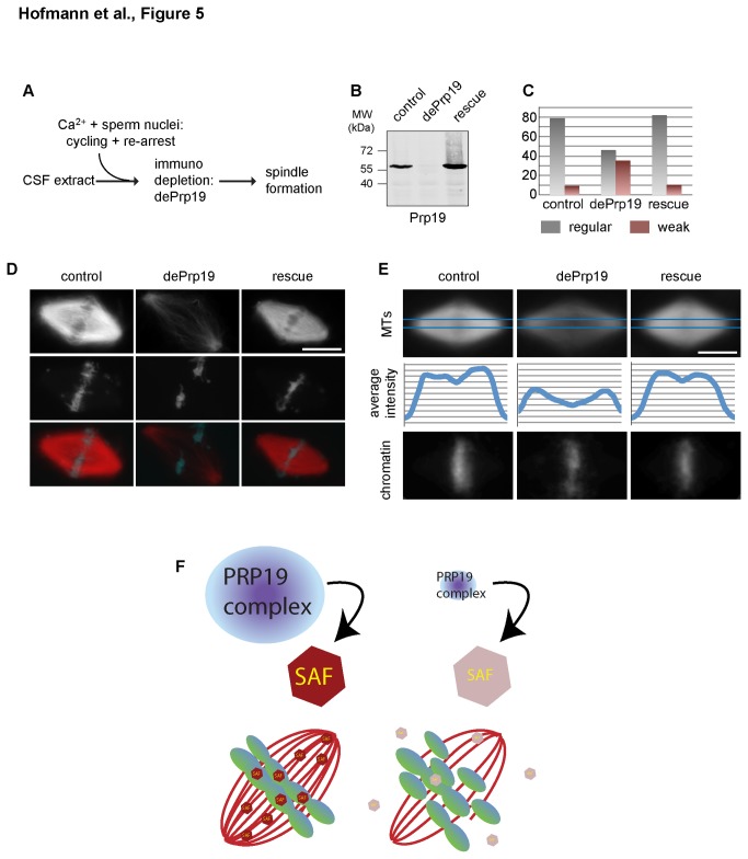 Figure 5. Immunodepletion of Prp19 directly in mitosis compromises spindle assembly.Spindle assembly was monitored using sperm nuclei in egg extracts after a complete cell cycle. Immunodepletion was performed only after rearrest in mitosis. (A): schematic overview of experimental setup. (B): Immunoblot to show depletion and rescue using a Prp19 specific antibody. (C): Quantification of normal (grey) and weak spindles (red). (D): Representative images of normal and weak spindles in control, depleted (dePrp19) and reconstituted extracts (rescue). (E): 30 spindles were analyzed under the conditions indicated, aligned and averaged (z-projection, average, ImageJ). upper panels (microtubules): average microtubule intensity projections. Graphs show average intensity distributions along the pole-to-pole axes indicated in projections in blue (middle panels). Lower panels: chromatin distributions as determined from the DAPI signal. Scale bars: 20 µm. (F): Model to explain the defects in spindle formation after Prp19 knock-down or depletion. Left: control situation: Prp19 modifies an unknown Spindle Assembly Factor (SAF), which directly contributes to spindle formation by modifying properties of microtubules as a microtubule associated protein, or working as a kinetochore-associated protein in stabilizing kinetochore to microtubule attachments. Right: after knock-down or immunodepletion of the Prp19 complex, the regulated SAF looses its function in spindle formation.