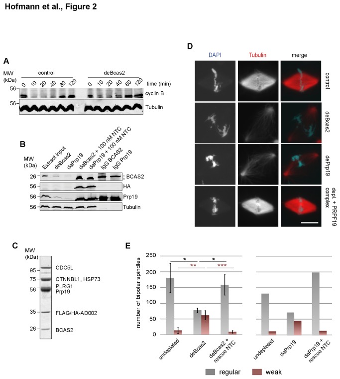 Figure 2. Depletion of the Prp19 complex disturbs spindle formation in Xenopus egg extracts.(A): Control Xenopus egg extracts or extracts after depletion of the Prp19 complex (deBCAS2) were released from metaphase (times after release are indicated) and the degradation and re-accumulation of cyclin B was monitored by immunoblot. Tubulin served as a loading control. (B): Extracts were depleted of the Prp19 complex by antibodies against BCAS2 (deBCAS2) or Prp19 (dePrp19) and complemented with 100 nM purified human Prp19 complex (see C, Coomassie staining). Extract samples, and the immunoglobulin beads after depletion, were analyzed by Immunoblot with Xenopus BCAS2 and Prp19 antibodies. Tubulin served as a loading control for the extract samples. (D): Spindle assembly was monitored in control, BCAS2 (deBCAS2), or Prp19 (dePrp19) depleted egg extracts, or in depleted extracts after re-addition of 100 nM Prp19 complex (see panel C) after a complete cell cycle in the presence of sperm nuclei (DAPI, DNA, blue in merge) and Cy3-tubulin (red in merge). Scalebars: 20 µm. (E): Quantification of normal (grey) and weak (red) spindles in control, depleted (dePrp19) and reconstituted extracts (rescue) spindles in 20 µl extract. The graph (left) shows values from three independent experiments +/- s.e.m. after depletion using BCAS2 antibodies, and from one representative experiment after depletion using Prp19 antibodies (right). Significance values (left) were calculated using an unpaired two-tailed T-test. *: P < 0.05, **: P < 0.01, ***: P < 0.001.