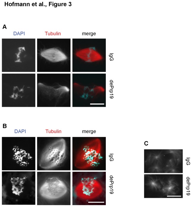 Figure 3. Immunodepletion of the Prp19 complex from Xenopus egg extracts does not compromise mitotic microtubule assembly in general.Xenopus egg extracts arrested in metaphase were depleted of the Prp19 complex using a specific antibody (dePrp19); an unspecific IgG served as a control. (A) Spindle assembly around sperm nuclei was monitored in Xenopus egg extracts after a complete cell cycle. (B): Spindle assembly around chromatin beads was monitored in Xenopus egg extracts after a complete cell cycle. (A) -(B): Microtubules are shown in red, chromatin (DAPI) in blue. (C): Microtubule aster assembly upon Ran GTP addition was monitored in cycled egg extracts. Scale bars: 20 µm.