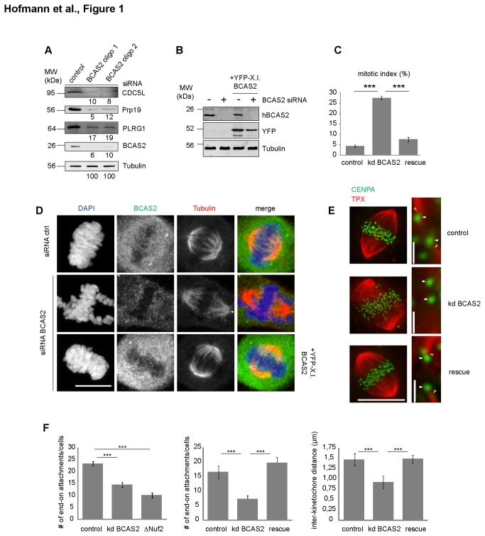 ortholog. (C) Quantification of mitotic indices determined from three independent experiments (N=500); graph shows mean values +/- s.e.m. Significance values were calculated using an unpaired two-tailed T-test. ***: P < 0.001. (D) BCAS2 expression and localization were analyzed by indirect immunofluorescence with BCAS2 (green in merge) and α-Tubulin (red in merge) antibodies. DAPI (blue in merge) was used to stain the DNA. (E and F) Cells after knockdown (kd) of BCAS2 (oligo 1), or control cells were immunostained with antibodies against the centromere protein CENPA (green) and the spindle protein TPX2 (red). Cells expressing X.l. YFP-BCAS2 were analyzed for the rescue situation. (E) Representative images. (F) the distance between white arrowheads (E) was quantified as interkinetochore distance; orange arrowheads (E) exemplify microtubule to kinetochore end-on attachments. Nuf2 knock-down cells served as a positive control. Quantifications were determined from three independent experiments (N=60); graph shows mean values +/- s.e.m. Significance values were calculated using an unpaired two-tailed T-test. ***: P < 0.001. Scalebars: 10 µm; 1 µm in magnifications in (E).
