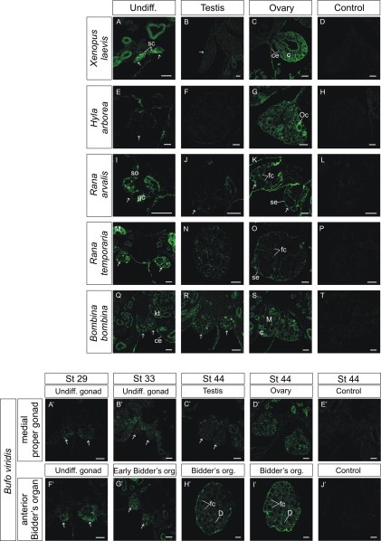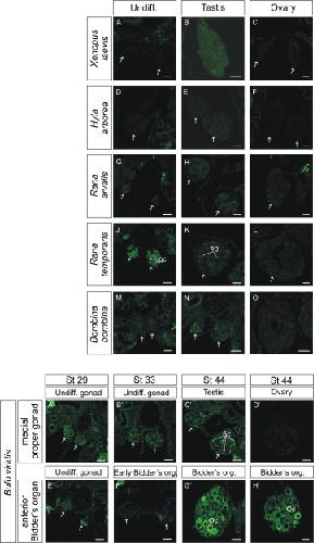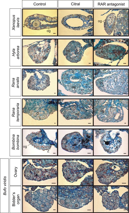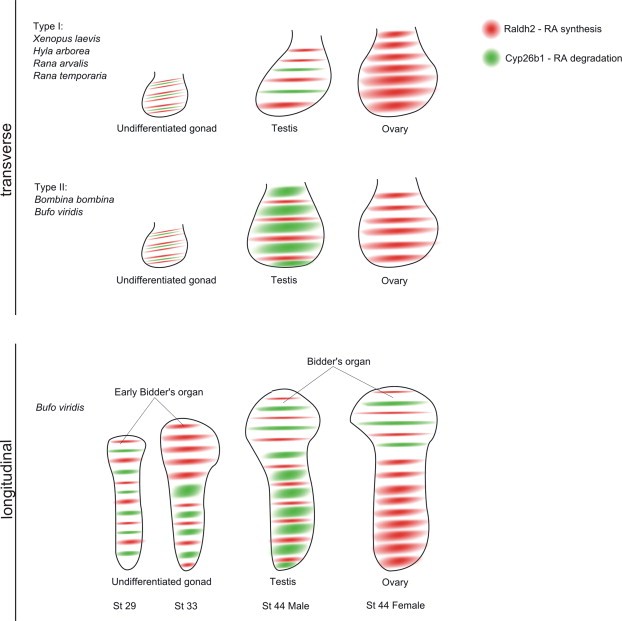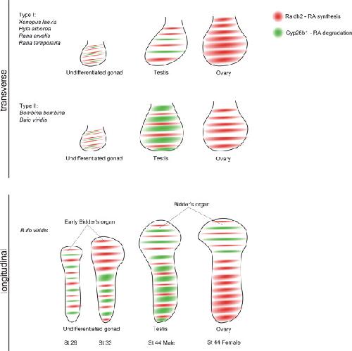 Retinoic acid homeostasis regulates meiotic entry in developing anuran gonads and in Bidder's organ through Raldh2 and Cyp26b1 proteins.