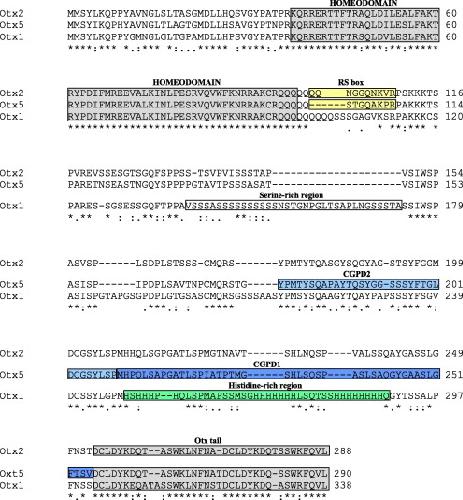 Fig. 1. Multi-alignment of Xenopus Otx1, Otx2 and Otx5. Multi-alignment of Otx sequences has been obtained using ClustaW. âââ: identical residue; â:â: conserved substitution; â.â: semi-conserved substitution. Homeodomain: shaded dark grey box; Otx tail: shaded light grey box; Otx2 and Otx5 retinal specificity boxes (RS box): shaded yellow boxes; Otx1 Ser-rich region: open box; Otx1 His-rich region: light green box; cement gland promoting domain D2 (CGPD2): shaded light blue box; cement gland promoting domain D1 (CGPD1): shaded blue box.