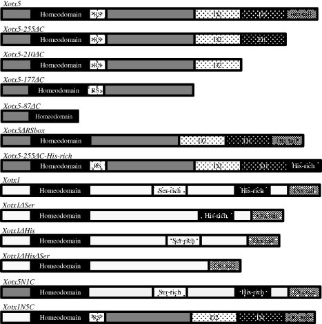 Fig. 2. Schematics of the constructs used in this study. Light grey: Xotx1 constructs; dark grey: Xotx5 constructs. RS: retinal specificity box; Ser-rich: serine-rich region; His-rich: histidine-rich region; D1: CGPD1; D2: CGPD2.