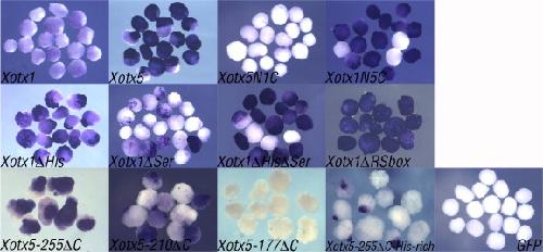 Fig. 3. Results of embryos microinjections and ag1 in situ hybridization. (A and B) A total amount of 800 pg of capped mRNAs corresponding to the different constructs as shown was ventrally (A) or dorsally (B) bilaterally microinjected in Xenopus embryos at 4-cell stage; embryos were grown to tailbud stage and processed by whole mount in situ hybridization with an ag1 probe. When microinjected dorsally (B), otx1, otx2 and otx5 induce posterior defects in Xenopus embryos; this activity is maintained by all constructs, but Xotx5-87δC. LacZ was coinjected as a tracer. Microinjection of LacZ alone was used as negative control.