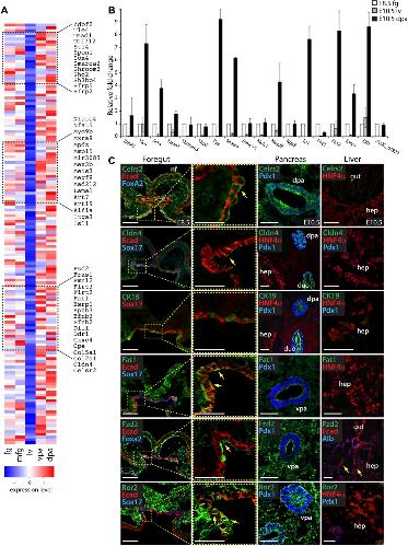 Figure 3. Analysis of candidate regulators of the pancreatic versus hepatic fate decision. (A) Heat map view of the FP group transcripts that were differentially expressed between any of two samples (150 transcripts out of 517; Cufflinks, P-value < 0.05). Colors represent high (red) or low (blue) expression values based on Z-score normalized FPKM values for each gene. White represents the average between red (high) and blue (low) expression values. Dashed boxes highlight gene sets validated by either RT-qPCR or immunofluorescence analyses. (B) RT-qPCR validation of a subset of differentially expressed genes of the FP group. Data were normalized to that of succinate dehydrogenase (SDHA) and are represented as fold change compared with the E8.5 foregut sample (set to 1 as calibrator). Error bars represent ±SEM. (C) Immunofluorescence analysis validated the exclusive localization of Celrs2, Claudin 4 (Cldn4), CK19, Fat1, Fzd2, and Ror2 in E8.5 foregut endoderm (see arrows in the insets) and pancreatic progenitors and their absence in the liver (see arrows). Micrographs show cross-sections of E8.5 and E10.5 mouse embryos. Bars, 50 μm. (duo) Duodenum; (hep) hepatic progenitors; (lv) liver; (nf) neural folds. |
