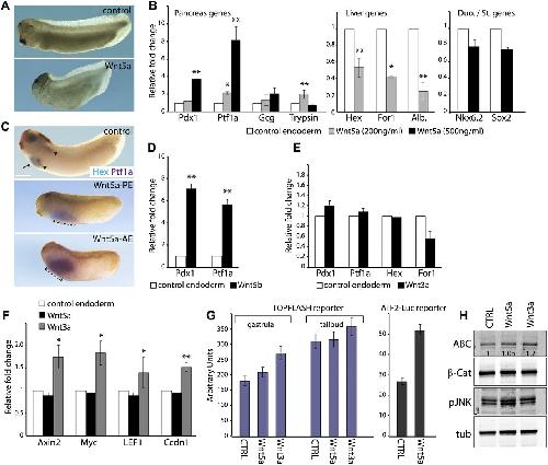 Figure 4. Noncanonical Wnt5a activity promotes pancreatic versus hepatic fate in the anterior endoderm. (A) Xenopus embryos injected with Wnt5a mRNA showed a shortened and mildly bent body at the tailbud stage, as previously described (Kim et al. 2005). (B) Endodermal explants were cultured in the presence of Wnt5a recombinant protein from stage 10, collected at the tadpole stage, and assayed for expression of the indicated pancreatic, hepatic, and duodenum/stomach genes by RT-qPCR analysis. Untreated anterior endodermal explants were used as control. Data were normalized to that of ornithine decarboxylase (ODC) and are represented as fold changes compared with untreated endoderm sample (set to 1 as calibrator). Error bars represent ±SEM. (C) Whole-mount double in situ hybridization analysis of Hex (light blue) and Ptf1a (purple) in control and Wnt5a-injected Xenopus embryos at the tadpole stage. The arrow indicates Hex expression in the liver bud, and arrowheads indicate Ptf1a expression in the two pancreatic buds (dorsal and ventral buds). Dashed lines mark expanded Ptf1a expression in the injected embryos. Total number of injected embryos = 61; 41% showed visible expansion of Ptf1a. (AE) Anterior endoderm; (PE) posterior endoderm. (D) RT-qPCR analysis of endodermal explants treated with Wnt5b (200 ng/mL) recombinant protein. Data were normalized to that of ODC and are represented as fold changes compared with untreated endoderm sample (set to 1 as calibrator). (E) RT-qPCR analysis of endodermal explants treated with 500 ng/mL Wnt3a recombinant protein. Data were normalized to that of ODC and are represented as fold changes compared with untreated endoderm sample (set to 1 as calibrator). (F) RT-qPCR analysis of direct downstream target genes of the Wnt/β-catenin pathway in endodermal explants treated with 500 ng/mL Wnt5a or 500 ng/mL Wnt3a recombinant protein. Data were normalized to that of ODC and are represented as fold changes compared with untreated endoderm sample (set to 1 as calibrator). (G) TOPFLASH and ATF2-luc reporter assays in Xenopus embryos. Four-cell stage embryos were injected into the vegetal blastomeres with 50 pg of TOPFLASH or 100 pg of ATF2-luc plus 25 pg of Renilla luciferase reporter plasmids. Endodermal explants were dissected at stage 9 and either left untreated as control (CTRL) or exposed to 500 ng/mL Wnt5a or 500 ng/mL Wnt3a recombinant protein, as indicated. Luciferase reporter assays were carried out in explants lysed at gastrula and early tailbud stages. (H) Western blot analysis of dissected anterior endodermal explants either left untreated as control (CTRL) or exposed to Wnt5a or Wnt3a recombinant protein. The relative ABC/tubulin levels in the treated explants compared with the control, which was set to 1.0, are indicated. (β-cat) Total β-catenin; (tub) α-tubulin. (*) P < 0.05; (**) P < 0.01, as determined by the REST program statistical analysis (Pfaffl et al. 2002). |