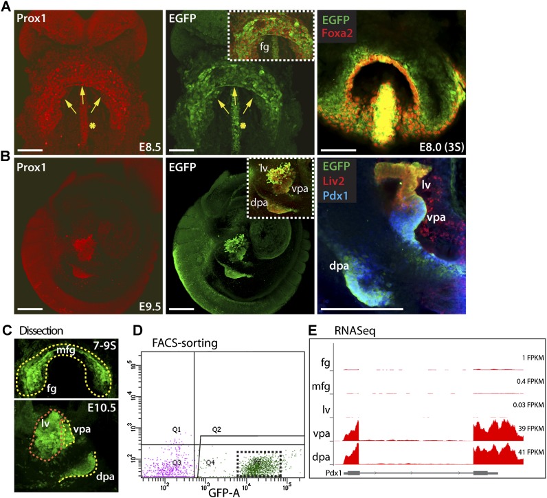 Figure 1. In vivo isolation and RNA-seq profiling of endoderm progenitor cells from Tg(Prox1-EGFP) mouse embryos. (A) Representative maximum confocal Z-projections of immunofluorescence analysis in Tg(Prox1-EGFP) E8.5 mouse embryos shows EGFP reporter expression in both ventral (arrows) and dorsal (asterisk) foregut cells, mirroring endogenous Prox1 expression (see the inset for overlay) and overlapping with Foxa2 expression domains at the three-somite (3S) stage. Embryos are presented in ventral view. (B) In Tg(Prox1-EGFP) E9.5 mouse embryos, EGFP expression was detected in the hepatic and both dorsal and ventral pancreatic buds, mirroring the endogenous Prox1 (see the inset for overlay). EGFP colocalized with Pdx1 in both pancreatic buds and with Liv2 solely in the liver bud. Embryos are presented in lateral view. (C–E) Schematic representation of cell sampling and the RNA-seq procedure. (C) EGFP+ fg and mfg endoderm at the seven- to nine-somite (7–9S) stage/E8.5 and liver (lv), ventral (vpa), and dorsal (dpa) pancreas at E10.5 were microdissected from Tg(Prox1-EGFP) embryos. Cells were dissociated and subjected to FACS. (D) Representative diagram of the EGFP+ cell fraction isolated by FACS. The dashed box indicates EGFP+-gated cells, and cells negative for EGFP are in purple. Transcript expression was profiled by RNA-seq. (E) Example illustrating the RNA-seq read coverage profile of the pancreatic-specific gene Pdx1. The Y-axis indicates the number of read counts in each cell population (Y-axis scale is 0 1000 counts). FPKM (fragments per kilobase of exon per million fragments mapped) values for Pdx1 in each data set are included on the right. Exons are depicted as gray boxes at the bottom on the X-axis. As expected, a large number of reads was found in pancreatic progenitors. Bars: A, 100 μm; B, 50 μm. |