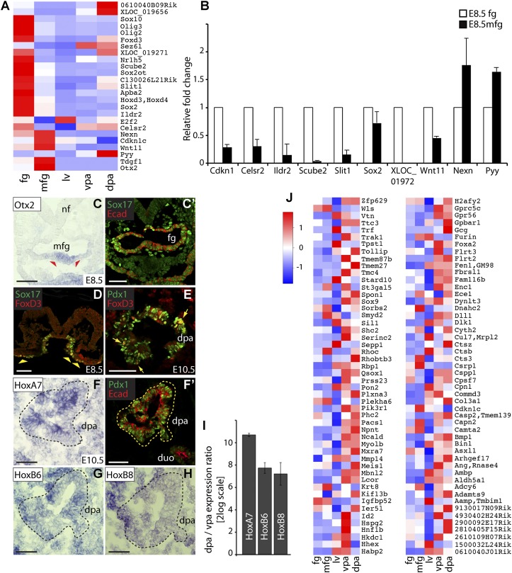 Figure 6. Identification of distinct spatial patterns within the mouse foregut endoderm. (A) Heat map view of the transcripts that showed significant differential expression between E8.5 fg and mfg (21 transcripts). Colors represent high (red), low (blue), or average (white) expression values based on Z-score-normalized FPKM values for each gene. (B) RT-qPCR validation of a subset of the foregut differentially expressed genes. The XLOC_019271 is not supported by any spliced ESTs or Genscan predictions. By exon junction analysis, we predicted a gene model and validated the expression of this novel transcript in the fg and dpa by RT-qPCR (see also Fig. 3B; Supplemental Fig. 8). Data were normalized to that of SDHA and are represented as fold change compared with the E8.5 fg sample (set to 1 as calibrator). Error bars represent ±SEM. (C–H) Immunofluorescence and in situ hybridization analyses validated the expression of the indicated genes in the E8.5 foregut endoderm (see arrowheads) and/or dorsal pancreatic rudiments (demarcated by dashed line). At E8.5, Otx2 expression was detected in the mfg (C), which coexpressed Sox17 and E-cadherin (Ecad), as shown by immunofluorescence staining on serial section (C′). FoxD3 expression was detected in the E8.5 fg endoderm (D; see arrowheads) and dpa cells at E10.5 (E). Arrows in E indicate FoxD3/Pdx1-double-positive cells. At E10.5, Hox gene expression was detected in the dorsal pancreatic rudiment (F–H), which coexpressed Pdx1 and E-cadherin (Ecad), as shown by immunofluorescence staining on serial section (F′). Bars, 50 μm. (I) RT-qPCR validation of the indicated Hox genes showed differential expression between the vpa and dpa. Data were normalized to that of SDHA and are shown as expression ratio (2-log values) of dpa sample versus vpa sample. Error bars represent ±SEM. (J) The heat map shows the expression of 100 mouse genes found to be expressed in both the vpa and dpa (>10 FPKM) and whose human orthologs are also expressed in human pancreatic “progenitor-like” cells (Micallef et al. 2012). |