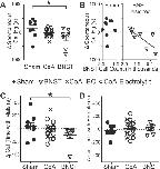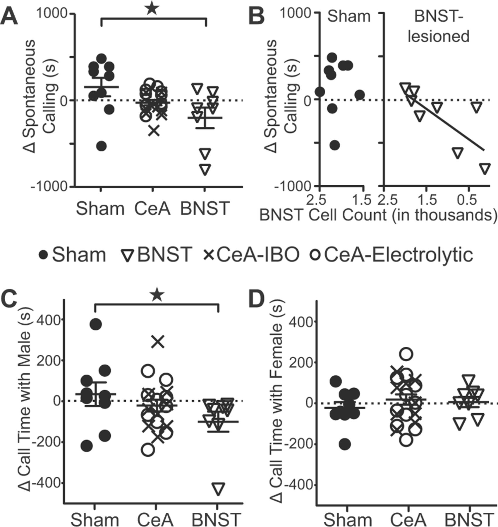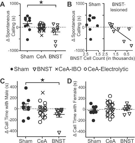 Figure 8. Vocalization rates decrease after BNST lesion. A, The prelesion to postlesion change in the time of spontaneous vocalization differed for sham- and BNST-lesioned males. Star and brackets indicate significantly different populations (Kruskal–Wallis K = 5.756, p = 0.053). B, The prelesion to postlesion change in the time of spontaneous vocalization was correlated with the number of cells remaining in the BNST (Pearson's r = 0.78, p = 0.001). C, The prelesion to postlesion change in the time spent vocalizing when paired with a male differed for sham- and BNST-lesioned males. Star and brackets indicate significantly different populations (Kruskal–Wallis K = 7.683, p = 0.0215). D, There was no prelesion to postlesion difference in the time spent vocalizing with a female for sham-, CeA-, or BNST-lesioned males. |
