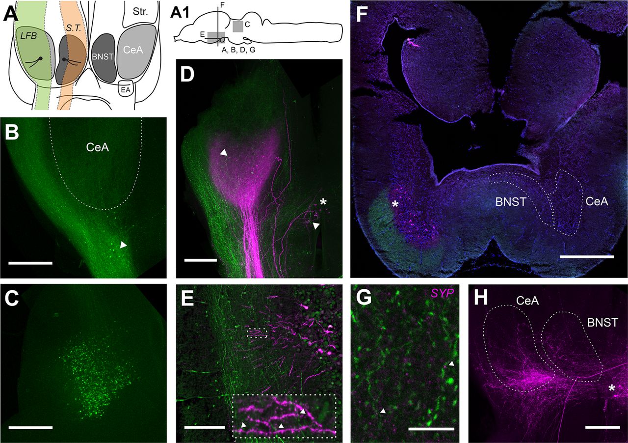 Figure 2. CeA and BNST in X. laevis. A, Schematic view of the caudal portion of the ventral telencephalon in X. laevis, viewed from below (rostral up). The boundaries of BNST and CeA are indicated on each hemisphere, with their respective associated fiber pathways overlaid on the left hemisphere: green represents LFB; orange, ST [stria terminalis]. Diagram single neurons in each nucleus show the typical orientation of cell bodies and dendrites in the nucleus with respect to the forebrain ventricle (not pictured) and the fiber tract. In the right hemisphere, the location of the adjacent nuclei of the basal ganglia is shown in white: Str., Striatum; EA, entopeduncular area, a pallidal homolog. A1, Schematic view of the entire brain of X. laevis in the sagittal orientation, showing the location of sections (lines) and whole-mount views (gray boxes) from subsequent parts of the figure. B, LFB and axon terminal field within the ventral subpallium labeled by CT injection in a whole-mount brain. z-stack image (500 μm thick) through caudal ventral telencephalon (horizontal plane, rostral up). The CeA is outlined by a white overlay. Arrowhead indicates back-labeled EA cells. Scale bar, 250 μm. C, CT cells back-labeled by CeA injection in a whole-mount brain. z-stack image (500 μm thick) through dorsal thalamus (horizontal plane, rostral up). Scale bar, 250 μm. D, Caudal telencephalon in a whole-mount brain after double-label with CT (green) and DTAM (magenta) injections. z-stack image (375 μm thick) in the horizontal plane (rostral up). Arrowheads indicate back-labeled DTAM-projecting cells (magenta). Although the green CT axons extend into the more rostrally located striatum, the DTAM terminal field and DTAM-projecting cells are restricted to the caudal portion of the subpallium. No back-labeled cells are seen in EA after DTAM injection. Axons connecting CeA and DTAM are also contained within the LFB, but in a more medial location than CT axons (green). Back-labeled cells (both magenta and green) can also be seen in APOA (asterisk). Scale bar, 250 μm. E, High-power (40Ã) image of anterogradely labeled CT axons (green) within the LFB interacting with locally labeled CeA dendrites (magenta). Horizontal section, rostral up. Scale bar, 50 μm. Dashed boxes indicate the areas shown at expanded magnification in the inset. Arrowheads indicate three example sites of putative synaptic contacts between boutons and spines. F, Transverse section through caudal telencephalon just rostral to APOA after double-label with CT (green) and DTAM (magenta) injections. The CT axon terminal field is clearly restricted to the outer half of the CeA dendritic fields and neatly overlaps the more proximally located terminal field (asterisk) and cell bodies back-labeled by DTAM injection. The combination of DTAM and CT labeling delineates the border of CeA with the BNST medially and the medial amygdala dorsally (see white overlay on contralateral side). Scale bar, 500 μm. G, Synaptophysin (SYP) puncta (magenta) located on CT axons (green). High-power (63Ã) z-stack image (4.5 μm thick) in the horizontal plane (rostral up). Arrowheads indicate two example puncta located on axons labeled by tracer injection into CT. Scale bar, 10 μm. H, Axon terminal fields within CeA and BNST labeled by contralateral CeA injection. z-stack image (400 μm thick) in the horizontal plane (rostral up). White dashed overlay outlines the BNST area as distinct from CeA. The projection from CeA is bilateral; however, terminal fields within the ipsilateral hemisphere are obscured by the proximity of the dye injection. Back-labeled cells within APOA can be seen at lower right (asterisk). Scale bar, 250 μm. |