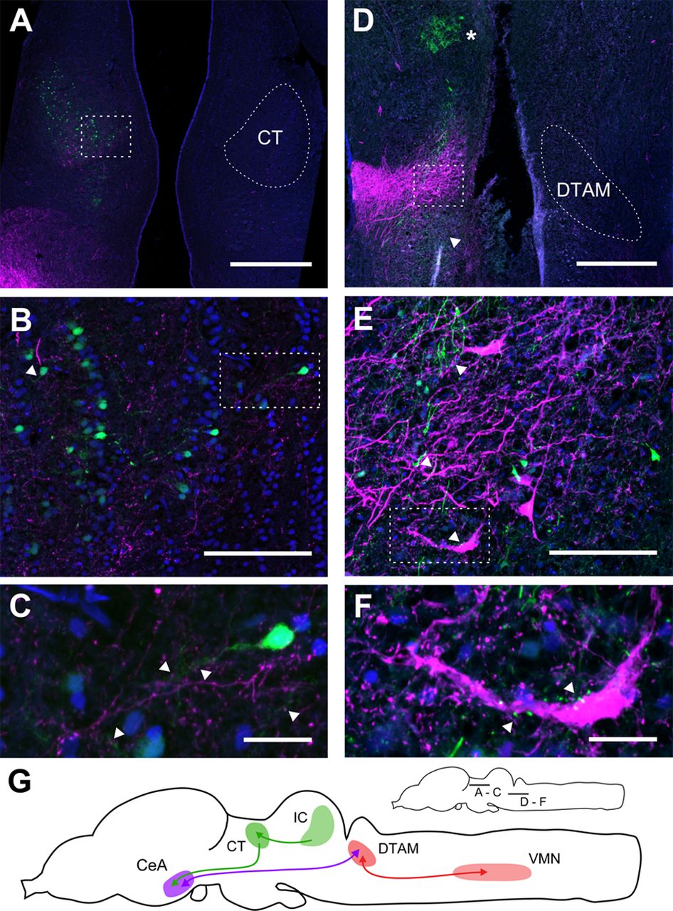 Figure 3. CeA connects to auditory and vocal circuits. A, Horizontal section through the dorsal thalamus after CeA (green) and IC (magenta) injections (rostral up). Green back-labeled CeA-projecting cells overlap anterogradely labeled terminal field of IC axons (magenta) within CT (see white overlay on contralateral hemisphere). Magenta at lower left is a fiber tract that originates from the injection site (located just below the bottom of the panel). Scale bar, 500 μm. B, Expanded view of region indicated by the dashed box in A, showing the overlap of back-labeled cells and the IC terminal field in greater detail. Proximal dendrites can be seen extending from back-labeled cell bodies (arrowhead). Blue channel is nuclear label from DAPI staining. Scale bar, 50 μm. C, Expanded view of region indicated by the dashed box in B, showing magenta axon boutons making apparent contact with proximal dendrites of green back-labeled CT cells (see arrowheads). Scale bar, 20 μm. D, Horizontal section through the tegmentum and DTAM after CeA (green) and VMN (magenta) injections (rostral up). VMN injection labels both cells and terminal fields within DTAM (dashed box) and overlaps with the green terminal field of labeled CeA axons. White overlay on the contralateral hemisphere outlines the boundaries of DTAM at this level. Green terminal fields from CeA are also visible in the more rostral pedunculopontine tegmental nucleus (asterisk) and the nucleus of the tractus solitarus (arrowhead) located just caudal to DTAM. Scale bar, 500 μm. E, Expanded view of region indicated by the dashed box in D, showing overlap of back-labeled VMN-projecting cells and the CeA terminal field in DTAM. Instances of putative overlap of CeA axonal boutons (green) and VMN-projecting DTAM cells (magenta) are indicated by arrowheads. Blue channel is nuclear label from DAPI staining. Scale bar, 50 μm. F, Expanded view of region indicated by E, showing the overlap of axon boutons and proximal dendrites in greater detail. Scale bar, 20 μm. G, Schematic views of the entire brain of X. laevis in the sagittal orientation, showing the location of sections (lines) and a summary diagram of the connections described in Figures 1 and 2. Green represents auditory nuclei; red represents vocal nuclei. |