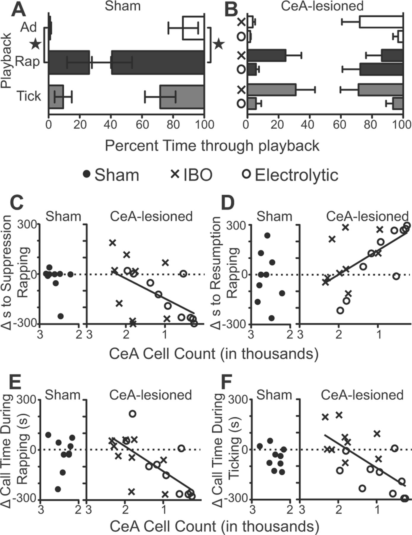 Figure 5. The response to playbacks was altered by CeA lesion. A, The time to suppression of calling (left y-axis) and the time to the resumption of calling (right y-axis) during playback are plotted for advertisement (Ad), rapping, and ticking. Sham-lesioned males suppressed earlier and resumed calling later during advertisement playbacks than rap playbacks (stars; Friedman, Dunn's multiple comparison, Q = 6.5, p = 0.03 for suppression; Q = 9.2, p = 0.006 for resumption). Advertisement playbacks were 15 min long; rap and tick playbacks were 5 min long, so that the x-axis is normalized for the duration of each playback. B, Using the same conventions as in A, CeA-lesioned animals show prolonged vocal suppression during advertisement, rap, and ticking playbacks. After IBO or electrolytic lesion, there was no significant difference in the time to suppression or resumption of calling during any playback (suppression: Friedman, IBO, Q = 6.0, p = 0.057; electrolytic, Q = 3.211, p = 0.1873; resumption: Friedman, IBO, Q = 0.9630, p = 0.5690; electrolytic, Q = 3.0, p = 0.2223). C, D, The prelesion to postlesion change in time to suppression (C) and time to resumption (D) was correlated with the number of cells remaining in the posterior CeA after lesion. The x-axes are reversed, with higher cell counts on the left and lower on the right. The y-axis was calculated as ([post lesion behavior] − [prelesion behavior]), so positive numbers indicate greater postlesion values. The fewer cells remaining in the CeA, the more rapid the time to calling suppression (C, Pearson's r = 0.54, p = 0.020) and the longer the time until call resumption (D, Pearson's r = −0.62, p = 0.01). E, F, The prelesion to postlesion change in the duration of calling during rapping (E) and ticking (F) playbacks was correlated with the number of cells remaining in the posterior CeA after lesion. The fewer cells remaining in the CeA, the less animals called during rapping (E, Pearson's r = 0.69, p = 0.001) or ticking (F, Pearson's r = 0.68, p = 0.001). |