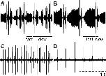 Figure 1. Example oscillograms of the male and female X. laevis calls described in this study. For male advertisement (A) and answer calls (B), the fast and slow trill phase of a single call are underlined. Female rapping (C) and ticking (D) communicate sexual receptivity or nonreceptivity, respectively. Each call segment is 2 s in duration. |