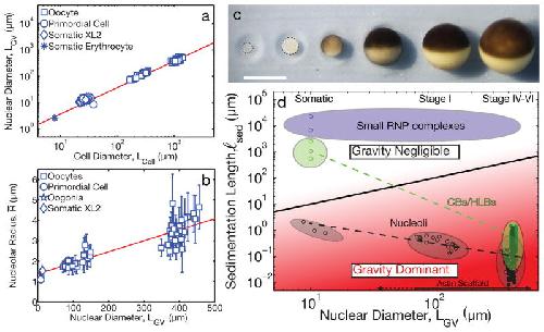 Figure 5. Cell size, organelle scaling, and gravitya, Linear scaling was observed between nuclear diameter, LGV, and cell diameter, Lcell from Stage I, IV, V, and VI oocytes and estimated from the literature (Supplementary Note). b, Linear scaling found between average nucleolar radius and nuclear diameter based on measurements in Stage I, IV, V and VI oocytes and estimated from literature (Supplementary Note). Nucleoli were measured from late stage oocytes (n=8 GVs), intermediate stage oocytes (n=17 GVs) and early stage oocytes (n=17 GVs). Error bars = s.d. Red solid line is the weighted best-fit line of the data. c, Cell growth during oogenesis in X. laevis. Each of the six stages is shown. Scale bar = 1 mm. d, State diagram of ℓsed vs. LGV. Black solid line separates region where gravity is negligible (white, ℓsed > LGV) from region where gravity dominates (red, ℓsed < LGV). Measurements (closed circles) and approximations (open circles) (Supplementary Note) are plotted for different nuclear bodies (black: nucleoli, green: HLBs/CBs, blue: small RNP complexes). For nuclear diameters > 10 μm, gravity becomes increasingly dominant for both HLBs and nucleoli, requiring a stabilizing F-actin scaffold. |