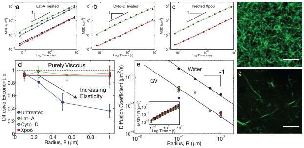 Figure 2. Actin disruption leads to purely viscous nuclear propertiesa, In Lat-A-treated oocytes, the MSD for all bead sizes exhibited diffusive-like behavior. Green: R=0.1 μm (19 z-positions from 9 GVs, 20,224 particles identified), blue: R=0.25 μm (28 z-positions from 15 GVs, 8,950 particles identified), black: R=0.5 μm (23 z-positions from 14 GVs, 3,261 particles identified), red: R=1.0 μm (23 z-positions from 11 GVs, 1,642 particles identified). b, Similar behavior was observed in Cyto-D treated oocytes. Green: R=0.1 μm (13 z-positions from 6 GVs, 7,754 particles identified) and red: R=1.0 μm (9 z-positions from 5 GVs, 382 particles identified). c, Similar behavior was observed in GVs injected with Xpo6 to deplete actin. Green: R=0.1 μm (21 z-positions from 10 GVs, 42,411 particles identified) and red: R=1.0 μm (13 z-positions from 5 GVs, 1,218 particles identified). d, Under actin-disrupting conditions (Lat-A, Cyto-D, and Xpo6), α ≈1 for all bead sizes, while α < 1 for large beads in native GVs. e, The diffusion coefficient, D, of beads in actin-disrupted GVs exhibits a roughly R−1-dependence expected from the Stokes-Einstein equation; small beads in untreated GVs have a comparable value of D (blue square). Solid black symbols are beads diffusing in water. The color scheme is as in d. Inset shows the scaled MSD·R against lag time. f, Lifeact::GFP image showing the native actin network in a live GV. g, Lifeact::GFP image of the fragmented actin network after Lat-A treatment. Scale bars = 5 μm. |