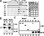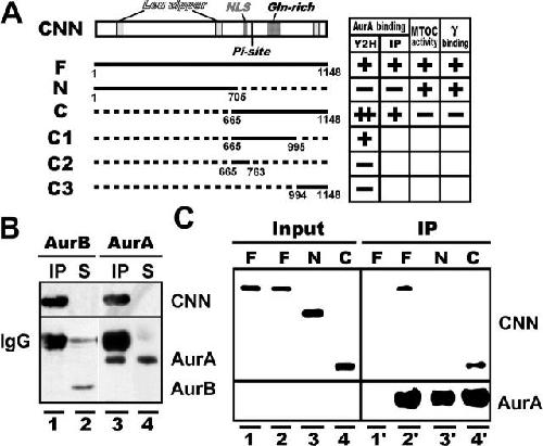 Figure 1. Interaction of Aurora-A with CNN and γ-tubulin. (A) A map of CNN and its deletion constructs capable of association with Aurora-A assayed by yeast two-hybrid screening (Y2H) and immunoprecipitation (IP). Microtubule-nucleating activity (MTOC activity) and γ-tubulin interaction (γ binding) are also summarized on the right. CNN contains characteristic regions, including leucine zipper motifs (Leu zipper), a potential nuclear localization signal (NLS), a putative Aurora-A phosphorylation site (Pi-site), and a glutamine-enriched region (Gln-rich). Numbers indicate the positions of amino acids. (B) HA-tagged CNN binds to Aurora-A (lanes 3 and 4), but not Aurora-B (lanes 1 and 2), in S2 cells. Proteins in immunoprecipitated (IP) and nonprecipitated supernatant (S) fractions, prepared from HA-CNN–expressing (lanes 1 and 3) and –nonexpresssing (lanes 2 and 4) cells, were identified by blotting with HA, Aurora-A, and Aurora-B antibodies. (C) Aurora-A binds to the COOH-terminal domain of CNN. In vitro synthesized full (F), NH2-terminal (N), and COOH-terminal (C) domains of CNN (Input, lanes 1 to 4) were mixed with (IP, lanes 2′ to 4′) and without (IP, lane 1′) His-tagged Aurora-A purified from bacteria.