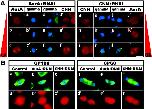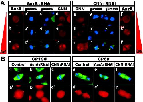 Figure 2. Immunolocalization of centrosome proteins at the spindle pole. (A) Double staining of mitotic S2 cells with Aurora-A/γ-tubulin and CNN/γ-tubulin after depletion of either Aurora-A (a–f) or CNN (g–l) by RNAi. DAPI staining is also shown in cells labeled with γ-tubulin (gamma). Different amounts of Aurora-A and CNN remained at the pole in depleted cells. Aurora-A and CNN are dependent on one another to localize at the spindle pole, and two proteins are required for recruiting γ-tubulin to the centrosome. (B) Localization of CP190 (a′–c′) and CP60 (d′–f′) in control (a and d), Aurora-A–depleted (b and e), and CNN-depleted (c and f) cells. The cells were also stained with α-tubulin and DAPI (a–f). Although depletion of Aurora-A and CNN predominantly induced abnormal spindles in monopolar/multipolar organization, spindles in bipolar orientation were selected to demonstrate the absence of centrosomal proteins at each pole. Bars, 10 μm.