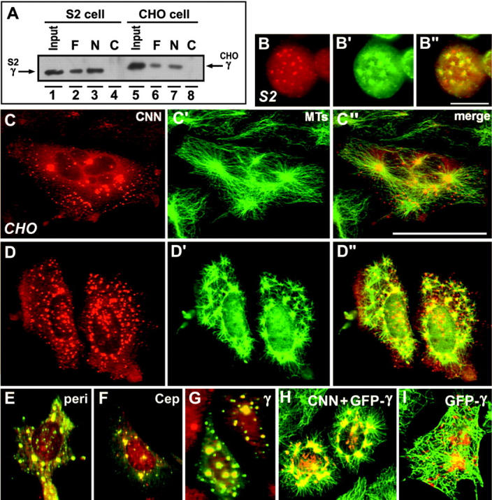 Figure 3. CNN interacts with γ-tubulin and induces microtubule-nucleating sites. (A) The NH2-terminal domain of CNN binds to γ-tubulin. Nickel beads conjugated with His-tagged full (F), NH2-terminal (N), and COOH-terminal (C) domains of CNN were incubated with cell extracts prepared from mitotic S2 (lanes 2–4) and CHO cells (lanes 6–8). Endogenous γ-tubulin is shown in lanes 1 and 5. (B–D) Immunostaining of HA-CNN–expressing S2 (B) and CHO cells (C–D) with HA (B–D) and α-tubulin antibodies (B′–D′). Merged images were shown in B′′–D′′. CNN expression caused the formation of cytoplasmic aggregates associated with microtubule asters. In D–D′′, cells were briefly recovered from nocodazole treatment before fixation. (E–G) Colocalization of pericentrin (E), Cep135 (F), and γ-tubulin (G) at the cytoplasmic foci induced by CNN expression. Merged images of CNN (green) and other centrosomal proteins (red) were shown. (H–I) Induction of GFP-tagged γ-tubulin in CHO cells coexpressing (H) or not coexpressing HA-CNN (I). To merge images, GFP was converted to red in double-stained cells with microtubules (green) and HA (green). Although expression of γ-tubulin alone induced cytoplasmic dots, microtubule-nucleating activity of the aggregates was detected only when γ-tubulin was coexpressed with CNN. Bars, 10 μm (B) and 50 μm (C–I).