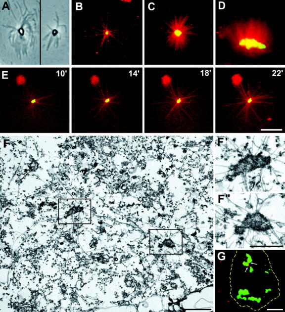 Figure 4. Cytoplasmic aggregates induced by CNN overexpression in mammalian cells. (A–D) In vitro microtubule nucleation onto CNN-containing sites detected by phase-contrast (A) and fluorescence (B–D) microscopy. GFP-tagged CNN aggregates were fractionated from CHO cells and incubated with X-rhodamine–conjugated brain tubulin. CNN aggregates in different sizes and shapes nucleated various numbers of microtubules. (E) Time-lapse images of GFP-tagged CNN-containing aggregates with assembled microtubules. CNN aggregates mixed with X-rhodamine tubulin were placed on a microscopic stage at time zero, and fluorescence images were taken at indicated times after the temperature was shifted to 37°C. (F) Thin-section EM of CHO cells expressing GFP-tagged CNN. The cells were briefly extracted with a detergent containing microtubule-stabilizing buffer before fixation. Two microtubule asters are seen in the field, and there is an electron-dense particle of different shape at each center. F′ and F′′ are close-ups of the areas outlined in F. (G) Immunofluorescence staining of 293 cells with anti-human centrin-2 antibodies (red). Dotted lines indicate the outline of a cell expressing CNN aggregates (green). There are two centrioles (arrows) that were not included in all sites induced by CNN overexpression. Bars, 10 μm (A–E, and G) and 1 μm (F–F′′).