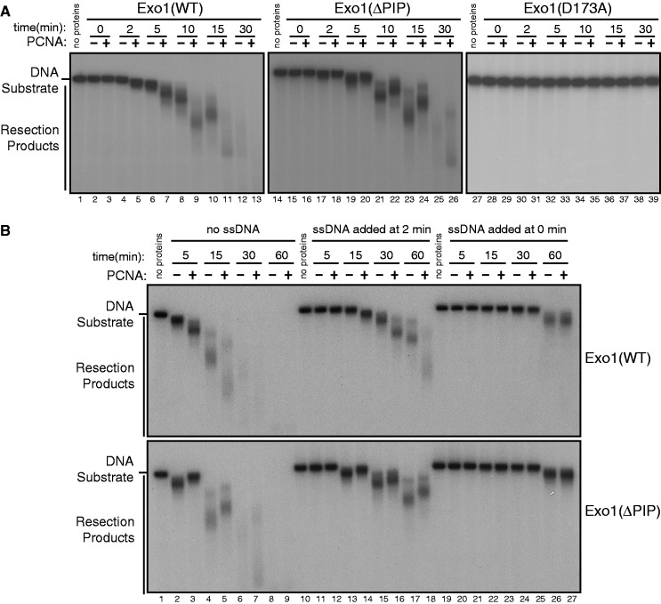 Exo1-mediated resection of DNA double-strand break ends generates 3' single-stranded DNA overhangs required for homology-based DNA repair and activation of the ATR-dependent checkpoint. Despite its critical importance in inducing the overall DNA damage response, the mechanisms and regulation of the Exo1 resection pathway remain incompletely understood. Here, we identify the ring-shaped DNA clamp PCNA as a new factor in the Exo1 resection pathway. Using mammalian cells, Xenopus nuclear extracts and purified proteins, we show that after DNA damage, PCNA loads onto double-strand breaks and promotes Exo1 damage association through direct interaction with Exo1. By tethering Exo1 to the DNA substrate, PCNA confers processivity to Exo1 in resection. This role of PCNA in DNA resection is analogous to its function in DNA replication where PCNA serves as a processivity co-factor for DNA polymerases.