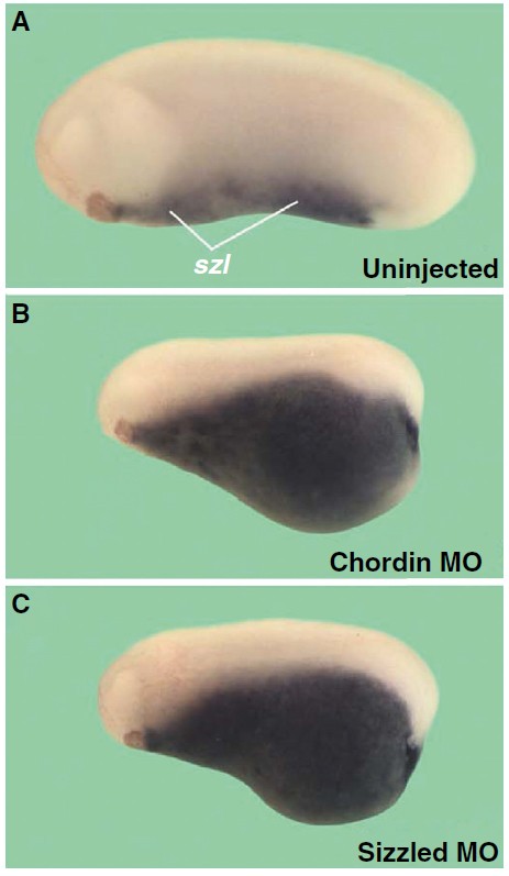 chd and szl mRNAs are expressed at opposite poles of the mid-gastrula [4]. The arrows indicate