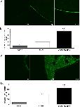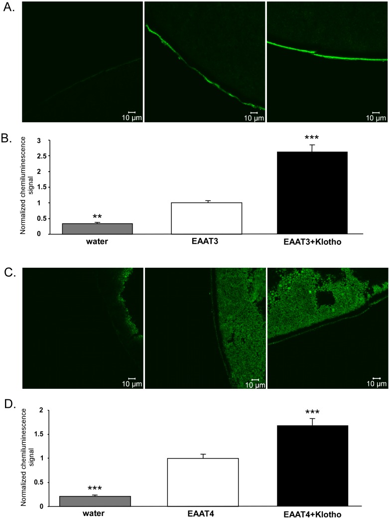 Figure 3. Effect of Klotho coexpression on protein abundance of both EAAT3 and EAAT4 in the Xenopus oocyte cell membrane.A, C: Confocal images of EAAT3 (A) and EAAT4 (C) protein abundance in the plasma membrane of Xenopus oocytes injected with water (1st panel), injected with cRNA encoding EAAT3 (A) or EAAT4 (C) without (2nd panel) or with additional coexpression of Klotho (3rd panel). B, D: Means ± SEM of EAAT3 (B, n = 75–80) and EAAT4 (D, n = 82–87) protein abundance as determined by chemiluminescence in the plasma membrane of Xenopus oocytes injected with cRNA encoding EAAT3 (B) or EAAT4 (D) without (white bars) or with (black bars) coexpression of Klotho. For comparison, water injected oocytes (grey bars).**,***(p<0.01, p<0.001) indicate statistically significant difference from Xenopus oocytes injected with cRNA encoding EAAT3/EAAT4 alone (ANOVA). |