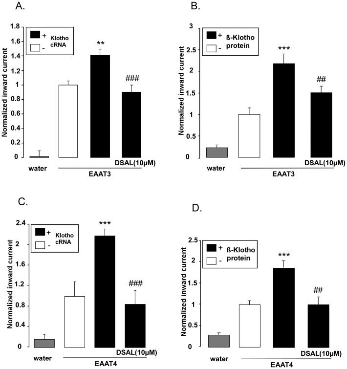 Figure 5. Reversal of the effect of Klotho on electrogenic glutamate transport in EAAT3 or EAAT4 expressing Xenopus oocytes by β-glucuronidase inhibitor DSAL.A: Means ± SEM (n = 9–21) of glutamate (2 mM)-induced current (Iglu) in Xenopus oocytes injected with water (grey bar) or injected with cRNA encoding EAAT3 alone (white bar) or both EAAT3 and Klotho (black bars). Where indicated, the oocytes were treated with β-glucuronidase inhibitor DSAL (10 µM).**(p<0.01) indicates statistically significant difference from oocytes injected with cRNA encoding EAAT3 alone (ANOVA). ### (p<0.001) indicates statistically significant difference from oocytes injected with cRNA encoding both EAAT3 and Klotho (ANOVA).B: Means ± SEM (n = 11–23) of glutamate (2 mM)-induced current (Iglu) in Xenopus oocytes injected with water (grey bar) or injected with cRNA encoding EAAT3 alone (white bar) or pretreated for 24 hours with 30ng/ ml recombinant human β-Klotho protein without (first black bar) or with the presence of β-glucuronidase inhibitor DSAL (10µM ) (second black bar).***(p<0.001) indicates statistically significant difference from non-treated oocytes injected with cRNA encoding EAAT3 alone (ANOVA). ##(p<0.01). indicates statistically significant difference from oocytes injected with cRNA encoding EAAT3 and treated for 24 hours with 30ng/ ml recombinant human β-Klotho protein (ANOVA).C: Means ± SEM (n = 5–23) of glutamate (2 mM)-induced current (Iglu) in Xenopus oocytes injected with water (grey bar) or injected with cRNA encoding EAAT4 alone (white bar) or both EAAT4 and Klotho (black bars). Where indicated, the oocytes were treated with β-glucuronidase inhibitor DSAL (10 µM).***(p<0.001) indicates statistically significant difference from oocytes injected with cRNA encoding EAAT4 alone (ANOVA). ###(p<0.001) indicates statistically significant difference from oocytes injected with cRNA encoding both EAAT4 and Klotho (ANOVA).D: Means ± SEM (n = 9–21) of glutamate (2 mM)-induced current (Iglu) in Xenopus oocytes injected with water (grey bar) or injected with cRNA encoding EAAT4 alone (white bar) and pretreated for 24 hours with 30 ng/ ml recombinant human β-Klotho protein without (first black bar) or with the presence of β-glucuronidase inhibitor DSAL (10µM, second black bar).***(p<0.001) indicates statistically significant difference from non-treated oocytes injected with cRNA encoding EAAT4 alone (ANOVA). ##(p<0.01). indicates statistically significant difference from oocytes injected with cRNA encoding EAAT4 and treated for 24 hours with 30 ng/ml recombinant human Klotho protein (ANOVA). |