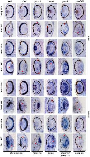 Genes referenced: arr3 cry1 egr2 emx1 emx1l en2 foxe3 neurod1 otx2 pax6 pou4f1 prox1 rax rho six3 sox11 sox12 sox13 sox3 sox4 tp53 vsx1